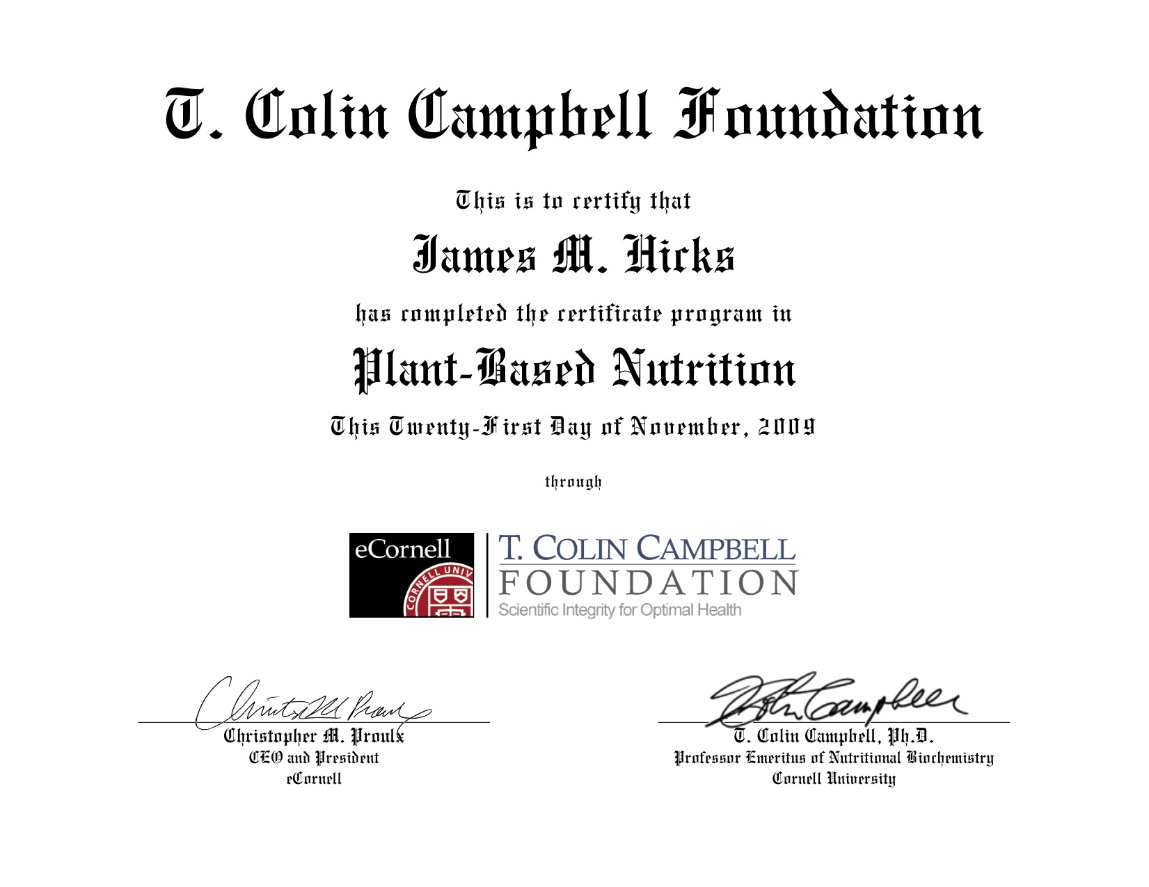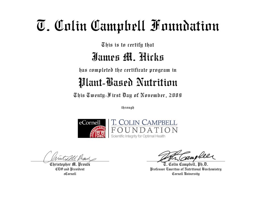 My Certificate in Plant Based Nutrition — Nov. 2009