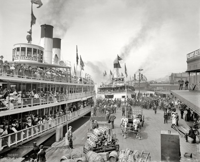 I have this photo set as my background on my computer and probably looked at it 10-15 times before I realized something.  None of the people in this photo are overweight.  I blew the picture up and looked at as many people as I could view and only found one guy who might have a small belly. (Pictured walking toward the camera holding his lapels)  Now either this was a convention of thin people on a boat cruise or something has happened to our diet (and possibly exercise routine – note bicycles in picture) in the last 100 years.  Compare this to the people who are loading onto a Carnival cruise ship today – Yikes. (Photo provided here in full size so you can check out the picture — Scroll down to the next picture for Bill’s photo of the modern day cruiser.)