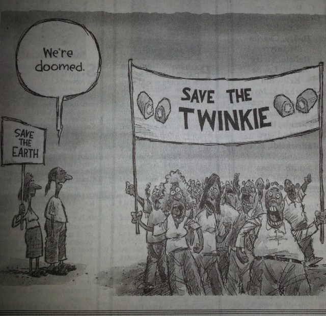 As for the Twinkie news, a friend in Houston sent me this cartoon from their local newspaper. It is a good indication of the challenge ahead as we strive to promote health for ourselves and for the planet.