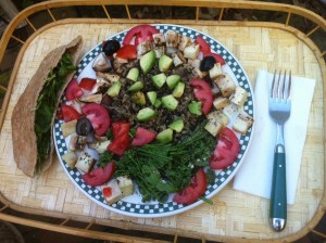 One of the staples of this meal is a mixture of grains and legumes that I prepare in advance on a weekly basis. With a one-serving portion of these calorie-dense starches always ready to go, I can easily whip up a complete meal within minutes. In addition to this key item, I also include generous portions of things like broccoli, spinach, eggplant, mushrooms, carrots, tomato, cucumber, olive and avocado.
